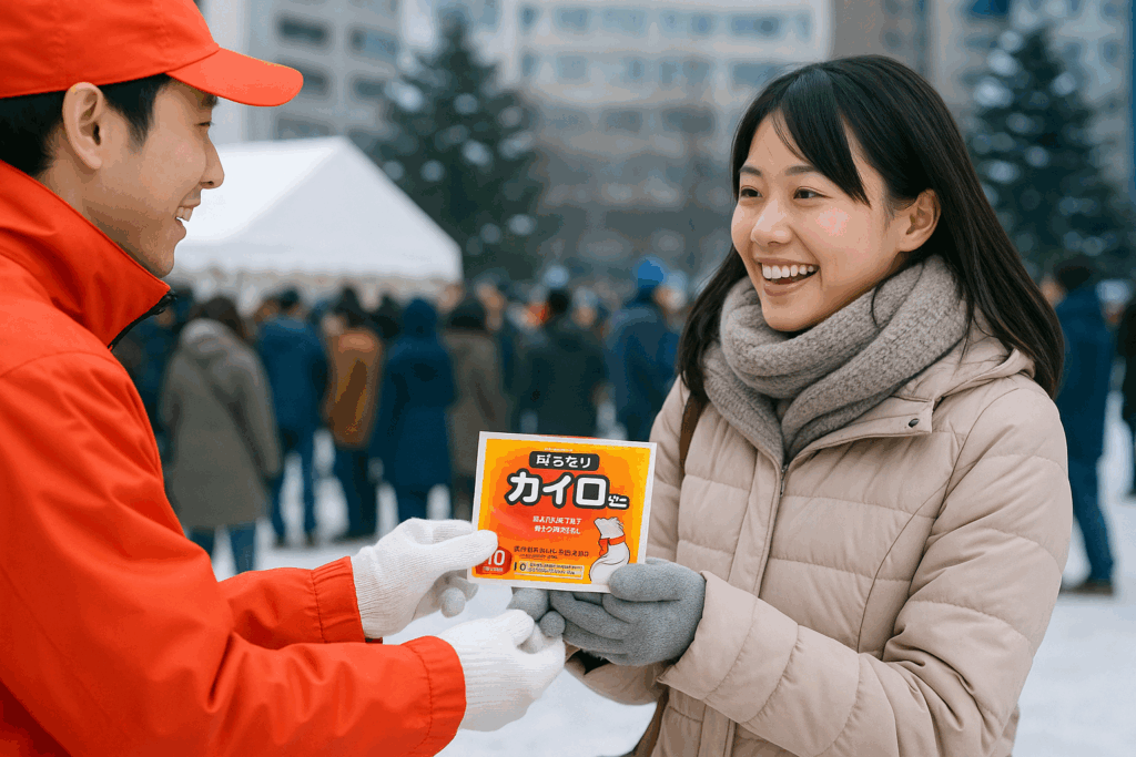 カイロは体に直接貼り付けるタイプではなく、手持ち用・袋入りタイプを配布するのが安心です。貼るタイプは低温やけどのリスクがあるため、万人向けのイベントでは不向きな場合があります。さらに、配布時には「低温やけどに注意」などの基本的な使用注意を口頭で伝えると丁寧さが伝わり、企業の印象もアップします。